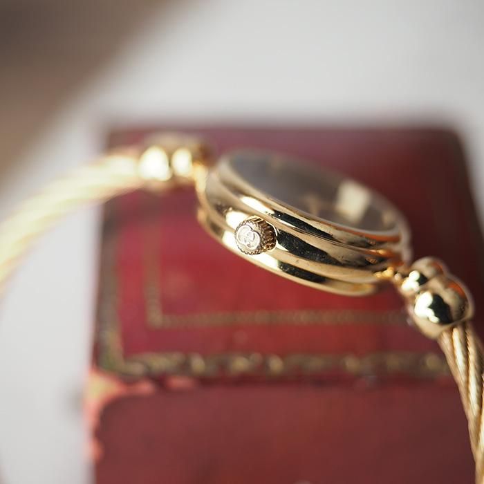 丸い文字盤とブレスレット状のバングルが可愛らしいデザインながら、
