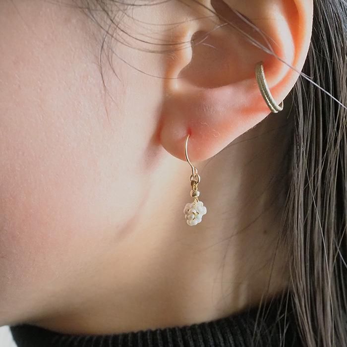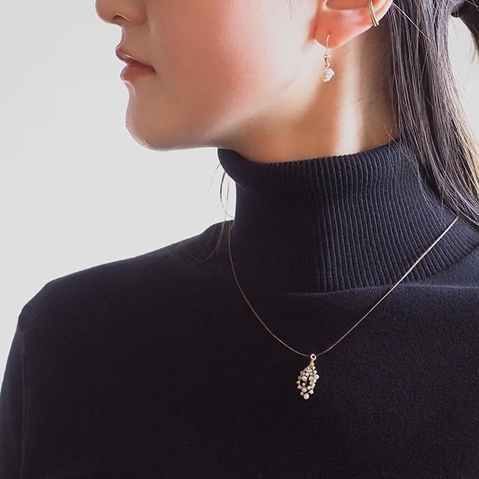 糸の柔らかい雰囲気が、ふんわり雪のようなパールのかたまりとなり優しい印象に。