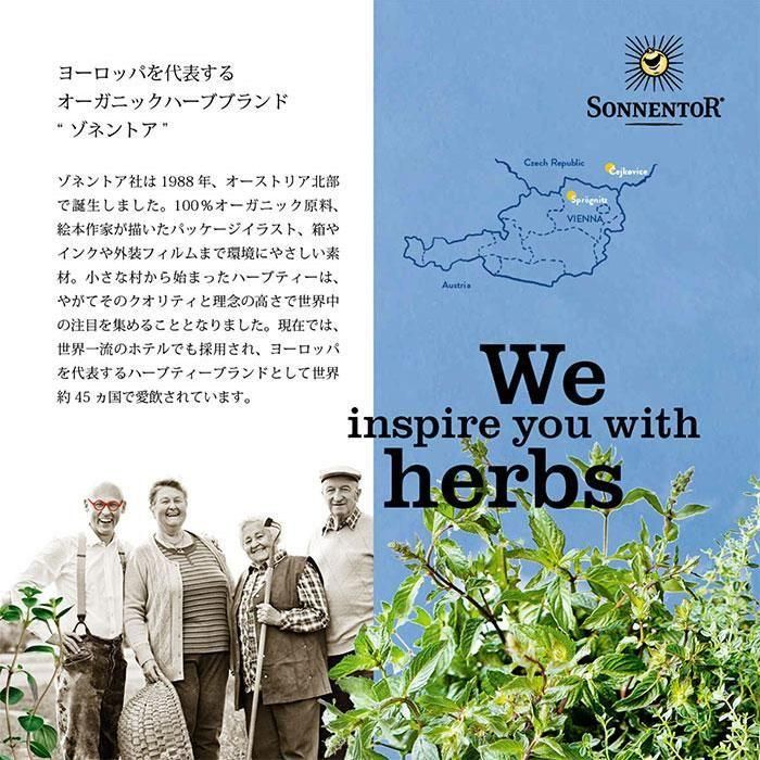 有機レモンバーム、有機エルダーフラワー、有機マリーゴールド、有機タイム、有機コーンフラワー