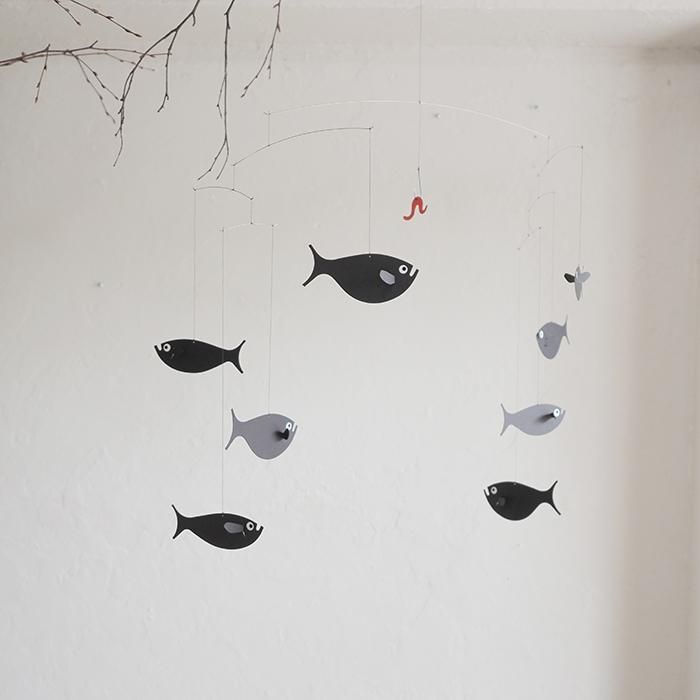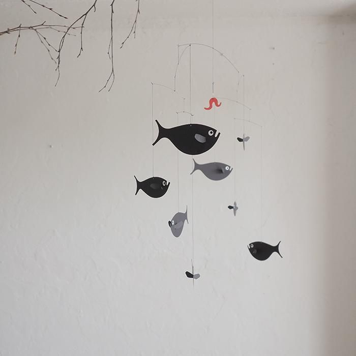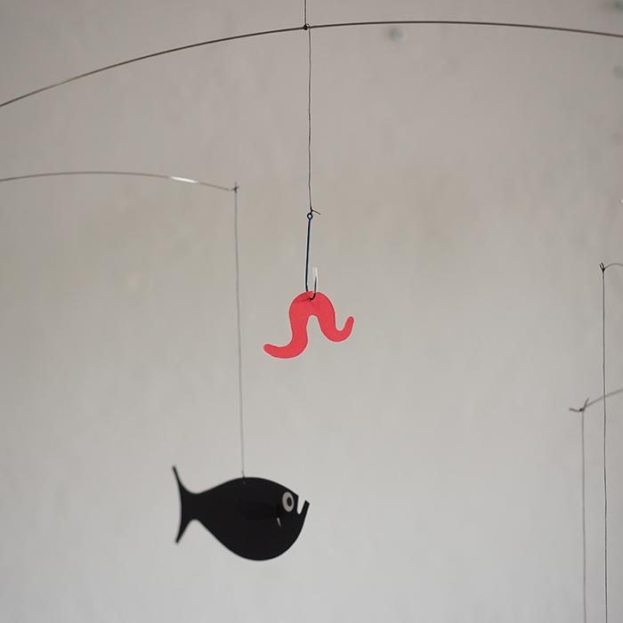 こちらは紙で作られた魚と、真ん中には釣り針にミミズがくっついていてユーモアのあるデザイン。
