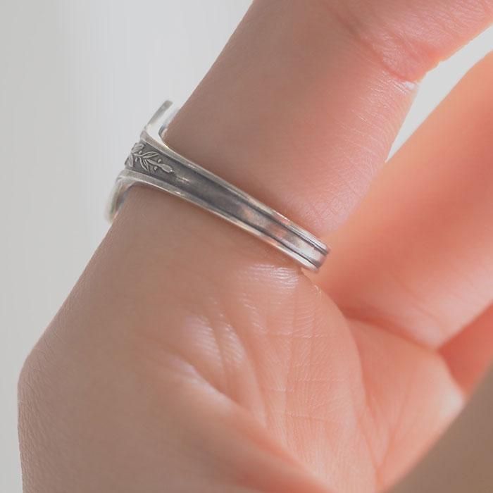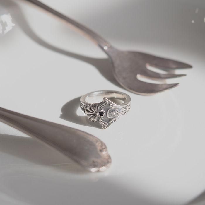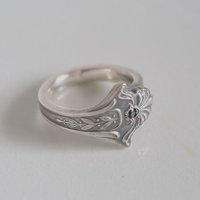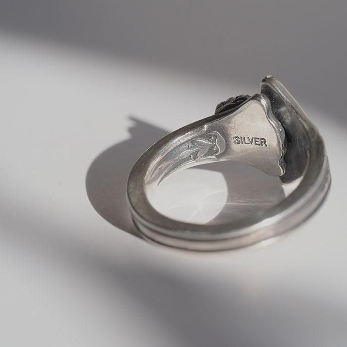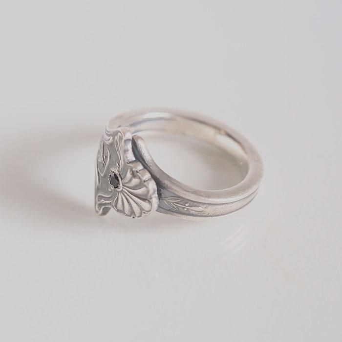 古いスプーンの柄に刻まれた繊細な装飾や曲線美を、そのままジュエリーへと映し取ったスプーンリング。